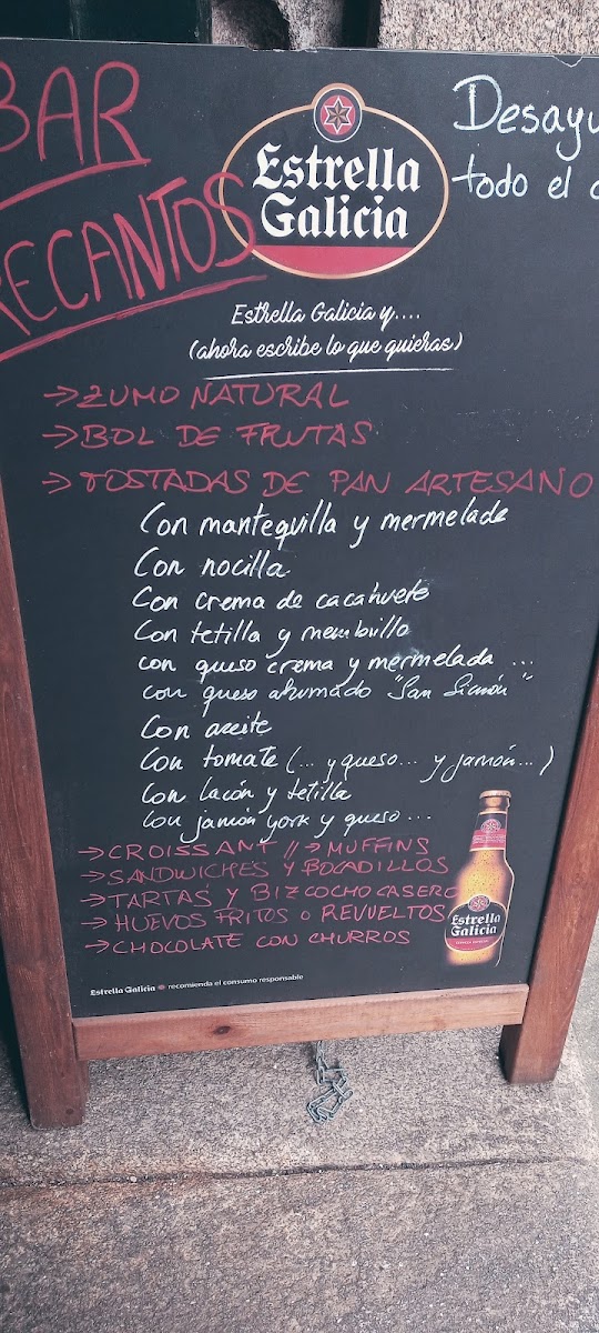 Welcome to RECANTOS BAR, a delightful gem nestled in the heart of Santiago de Compostela. Located at Rúa de San Miguel dos Agros, this café effortlessly blends charm with a relaxed atmosphere, making it an ideal spot for locals and tourists alike. The menu boasts a variety of tempting options, highlighted by the popular tostada con tomate, a beloved affordable breakfast choice among regulars.